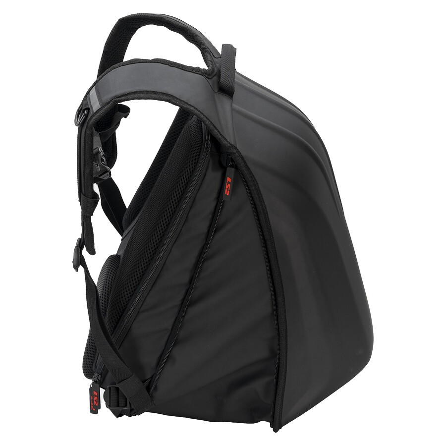LS2 Shield Backpack features a high-density thermoformed EVA shell with a PU coating for durability and impact resistance, combined with a water-repellent 900D polyester main body. It offers a 25L capacity, expandable to 50L for storing a full-face helmet, and includes a padded compartment for laptops up to 17 inches.
