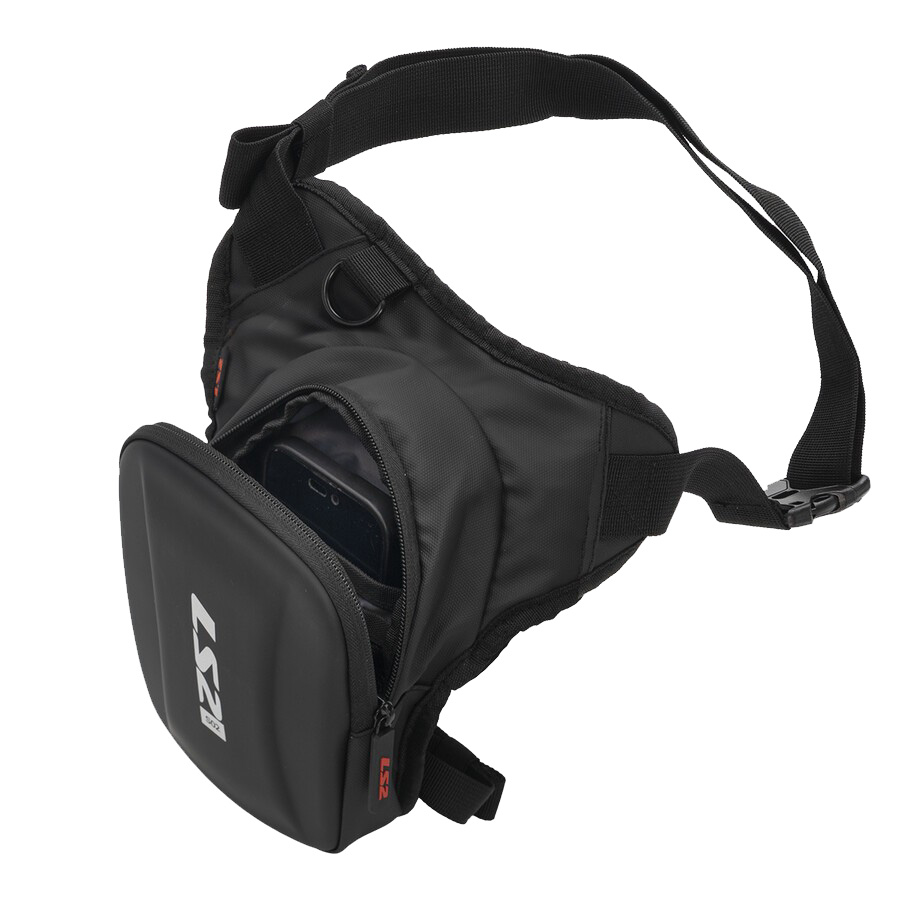 LS2 SHIELD LEG BAG is a compact storage solution with a thermoformed hard shell that provides structural integrity and impact resistance. Adjustable straps and a padded back panel are designed for stability during movement.
