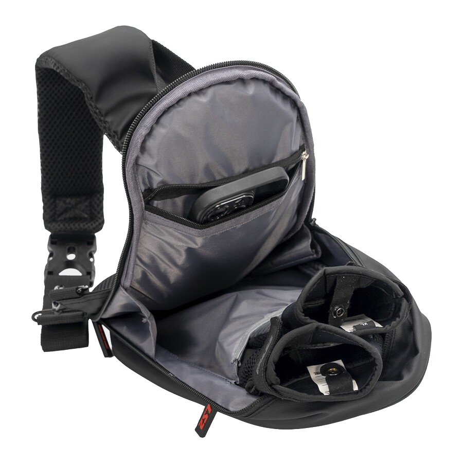 LS2 Shield Shoulder 4L Bag is constructed with a high-density thermoformed EVA shell (5mm, 75% hardness) covered with PU for structure and impact resistance, combined with a 900D Polyester outer. It offers 4 liters of capacity with internal elastic pockets and external zippered compartments for organization. The adjustable shoulder strap features breathable air mesh padding.